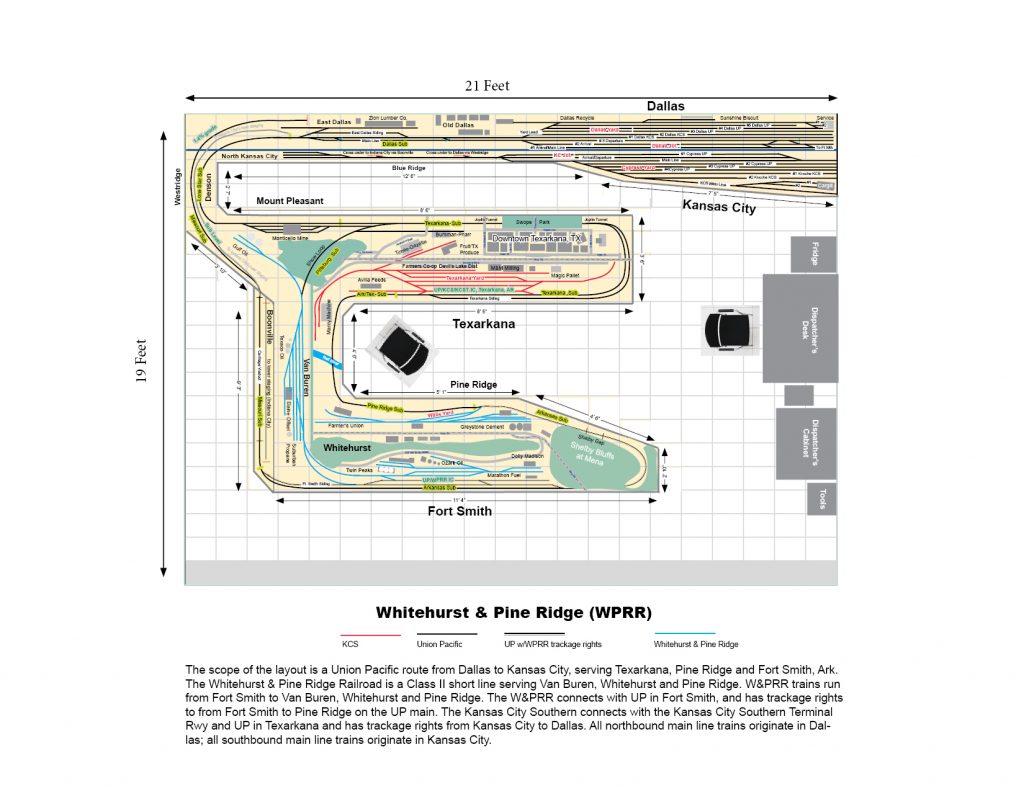 The layout’s scope is a protolance of UP’s route from Dallas to Kansas City. This iteration features the Class Is interchanging cars with the W&PRR in Fort Smith and Pine Ridge, AR, and KCST in Texarkana, AR. The W&PRR operates in Van Buren, Whitehurst and Pine Ridge and serves nine customers. KCST serves seven customers on the Texas side of Texarkana.